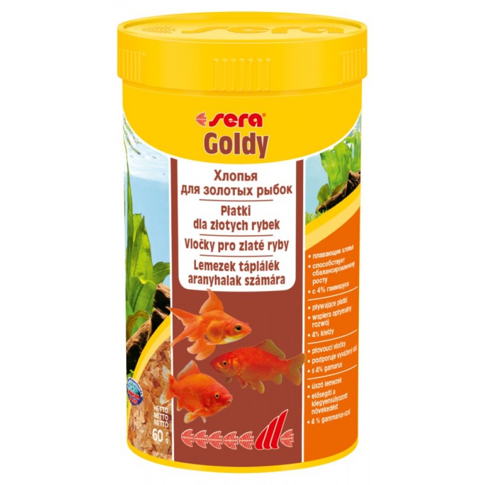 Корм Sera Goldy в хлопьях для каждодневного кормления всех видов золотых рыбок в аквариумах и садовых прудах. Золотым рыбкам требуется меньше белков и больше легко перевариваемых углеводов, чем тропическим рыбкам. Sera Goldy содержит спрулину и муку из пророщенной пшеницы, благодаря чему идеально подходит для кормления холодноводных рыб в аквариумах и прудах. Кормление рыб Sera Goldy осенью и ранней весной укрепляет рыб перед спячкой (при зимовке в водоёме).