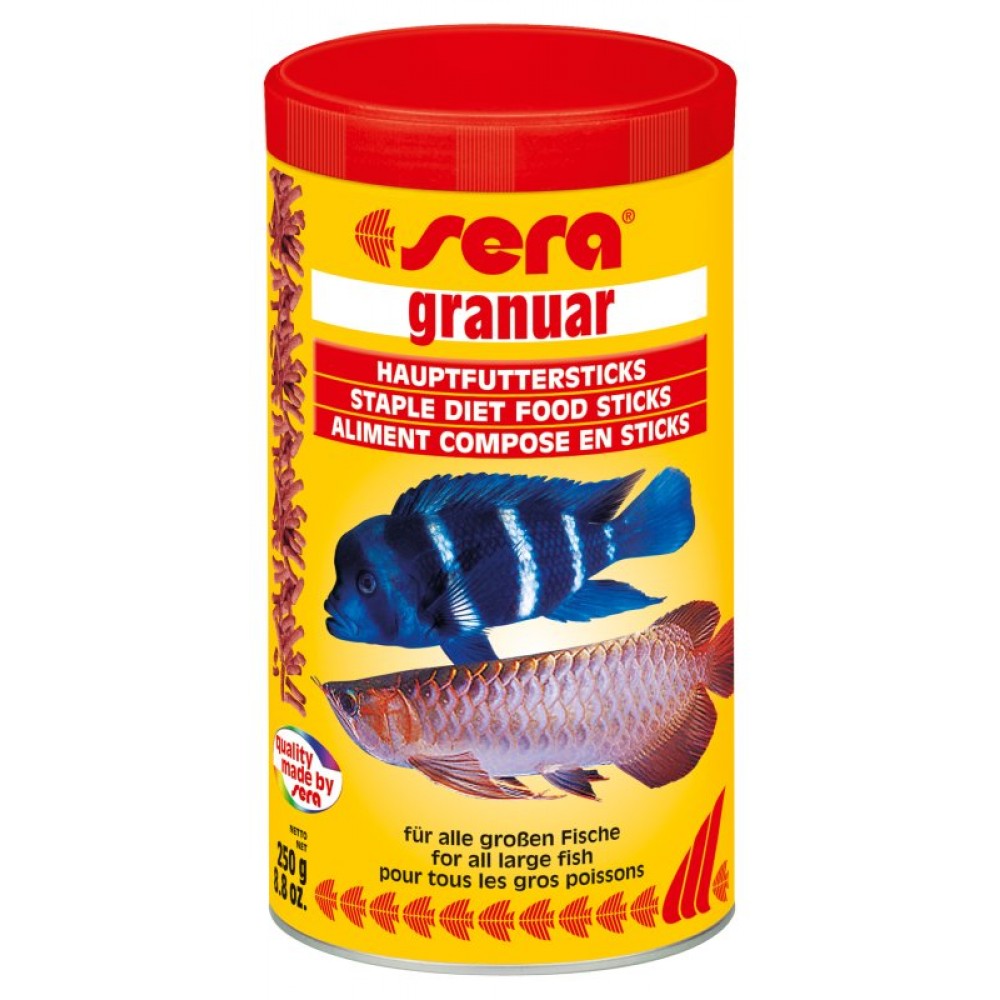 - Крупным рыбам, таким как арованы, астронотусы, крупные цихлиды, гигантские гурами, требуются особенно большие порции корма. Состав и размер палочек Sera Granuar позволяют полностью удовлетворить потребности этих удивительных аквариумных рыб.
