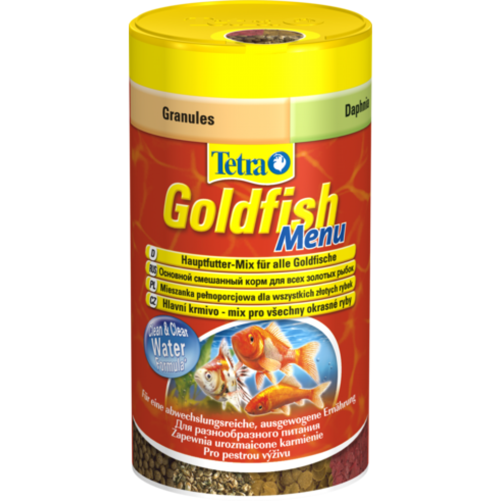 - Tetra Goldfish Menu - сбалансированный корм-меню для золотых рыбок и других холодноводных рыб, состоящий из 4-х разных видов кормов в одной банке, разделённой на 4 отсека, каждый из которых содержит отдельный вид корма:
