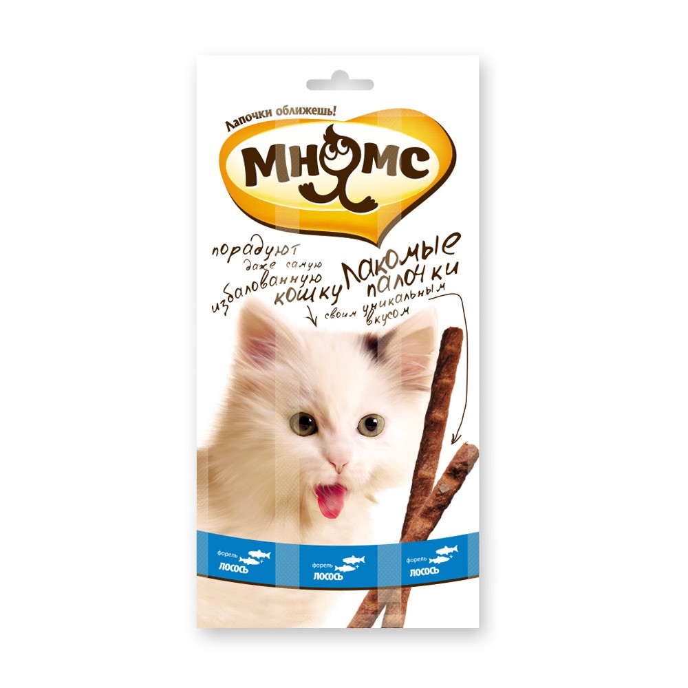 - Лакомые палочки для кошек с форелью и лососем «Мнямс» – вкусное и здоровое угощение, от которого не откажется даже самая привередливая и избалованная кошка. Каждая палочка индивидуально упакована, что позволяет сохранить запах и вкусовые качества надолго. Без искусственных ароматизаторов и красителей.